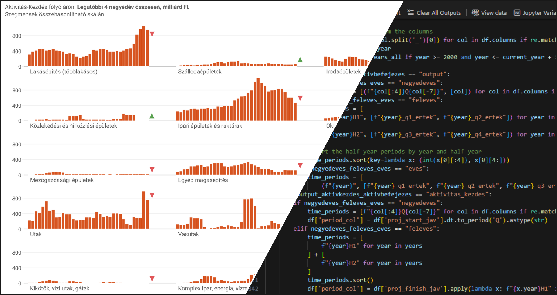 A poszter a két nagy építési részpiac Aktivitás-Kezdés indikátorának időszak/időszak változását mutatja, valamint a szegmenseket amelyekben a legnagyobb értékben indultak kivitelezések. Ezt a posztert minden hónapban kitesszük ide a blogunkra. A teljes építési piacot részletesen bemutató EBI Építésaktivitási Adatvizualizációt (összesen 18 szegmens adataival) is havonta frissítjük, és negyedévente az EBI Építésaktivitási Jelentésben is elmondjuk, hogy mit látunk a piacon. Ha érdeklik a részletek akkor a contact oldalon írjon nekünk.