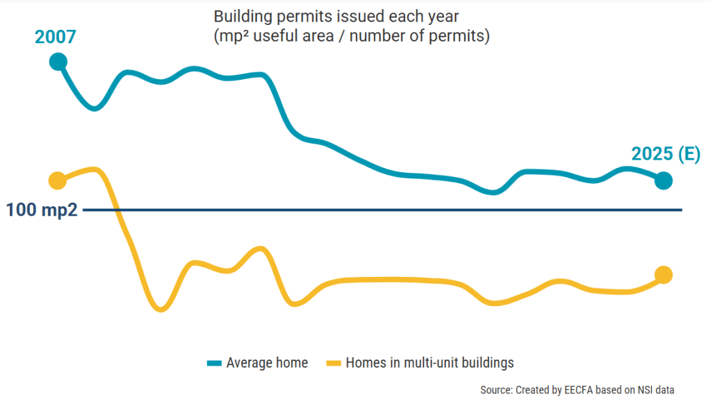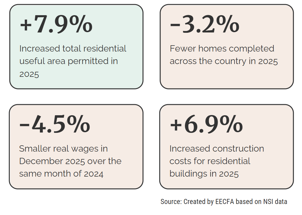 The optimism shown in the increased number of permits, and the useful building area in them, compared to 2024, is countered by the decline in the number of completed homes. Thus, while developers might be looking to the future, their actions in the present are lacking, also evidenced by a significant (-21%) annual decline in the value of started construction works in 2025 (source: EBI Construction Activity Report).