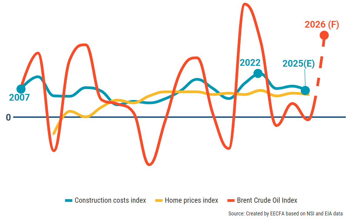 Construction costs boomerang. While previously the expectation was that construction costs would gradually decline in 2026, they proved quite resilient to changes in wages, and fuel and construction materials prices remained relatively stable in the past year. Thus, late 2025 forecasts placed construction costs on a small, descending trend.