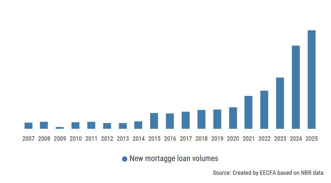 Increased reliance on mortgage loans. Despite the highest interest rates seen in a decade, the volume of new mortgage loans increased dramatically in 2024 and 2025. While some of this could be blamed on higher home prices, there remains a major portion that cannot be explained by price or transaction dynamics. Thus, it is quite likely that it reflects a reduced ability to buy homes without applying for a loan. This is also evidenced by the fact that the share of the population currently housed in a dwelling that was purchased with a mortgage loan grew steadily from a low of 0.5% in 2007, to 1.5% in 2024 (source: Eurostat). This could have been further boosted by the expected drop in interest rates as inflation seemed to be heading in the right direction. However, as of March 2026, this seems less likely, as the conflict in Iran would lead to another energy-led inflation event. Nonetheless, with real wages on the decline, mortgage loans will continue to be relied on for boosting home affordability.