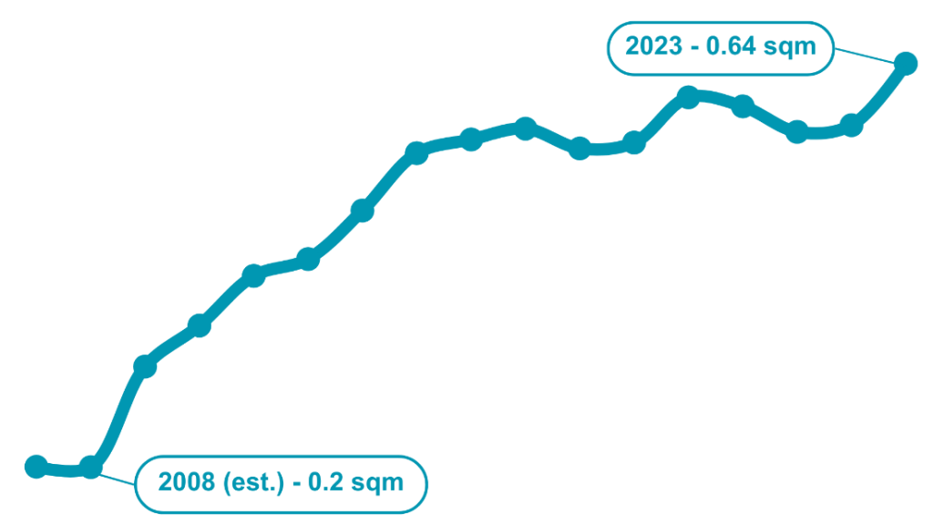 Most home purchasers are looking for a place to live, and for them affordability is a very important factor. A useful estimation is that of comparing average prices to the average income, an indicator we looked at in previous blog posts (here, and here) as well. While in 2007 the average monthly wage could buy you 0.20sqm in an average sized two-room flat, this steadily grew to around 0.50sqm in 2020. However, it declined to 0.45sqm in 2022, making homes slightly less affordable for the average worker.