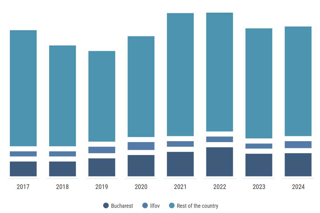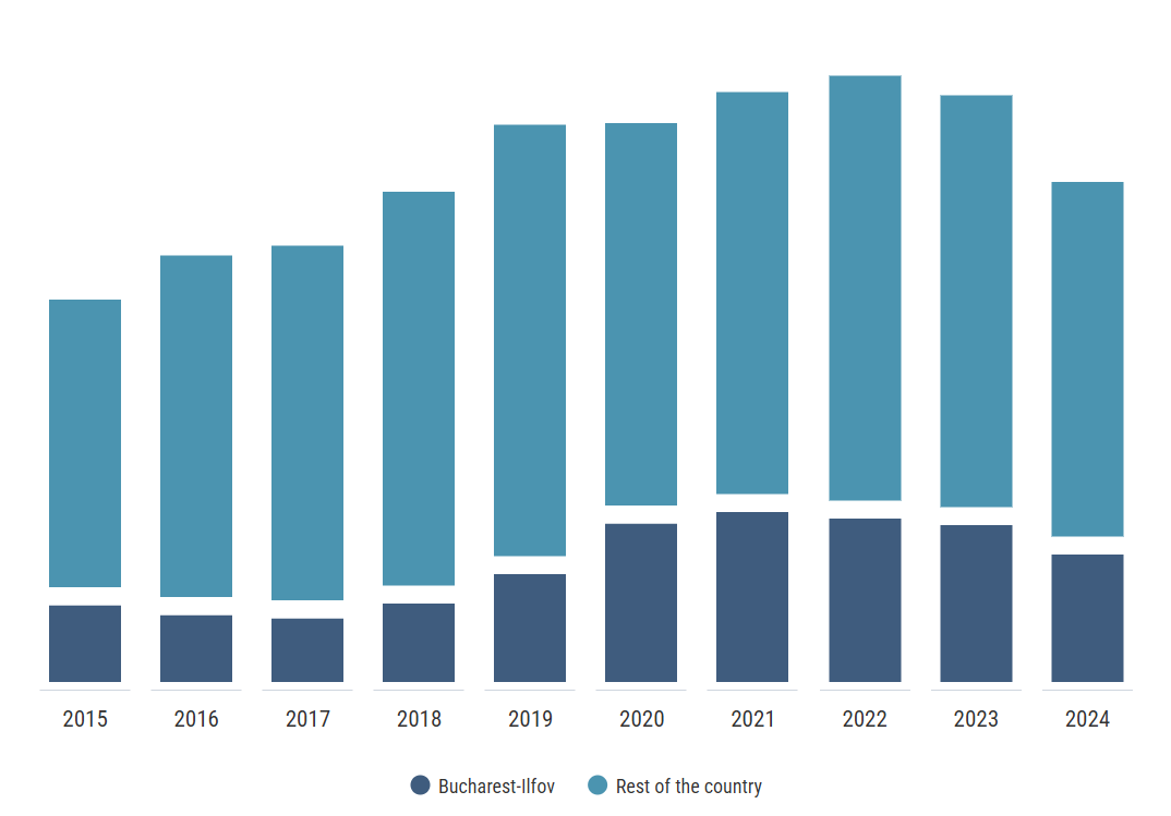 Looking at the number of transactions, they indeed declined overall in 2024 compared to the peak of 2021, but the effect was much smaller with just around 10% fewer properties being sold in the whole country, while in the Bucharest-Ilfov region there was barely any change (-0.3%).