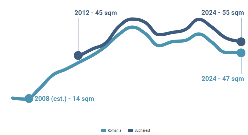 The next logical step seemed to be looking at other indicators such as completions and seeing what happened there. Indeed, they have also been on the decline with the number of completed homes country-wide in 2024 being comparable to that of 2018. Again, Bucharest-Ilfov saw a much larger drop in 2024 over the 2021 figures, standing at –33% compared to –12% in the rest of the country.
